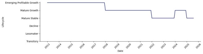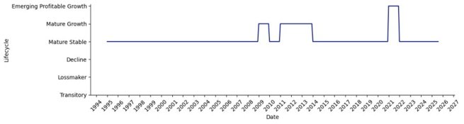 Companies are not bound to move linearly through lifecycle stages — they can reinvent themselves. It’s entirely possible for a firm in the Decline or Mature Stable stage to transition back into Emerging Profitable Growth. However, such a reversal typically requires meaningful innovation, a refreshed product line-up, and structural changes to reinvigorate a stagnating business model. We’ve observed several compelling examples of this kind of turnaround in practice; below is a series of charts showing how we classify the lifecycle stages of various large corporates over time, according to the framework above.