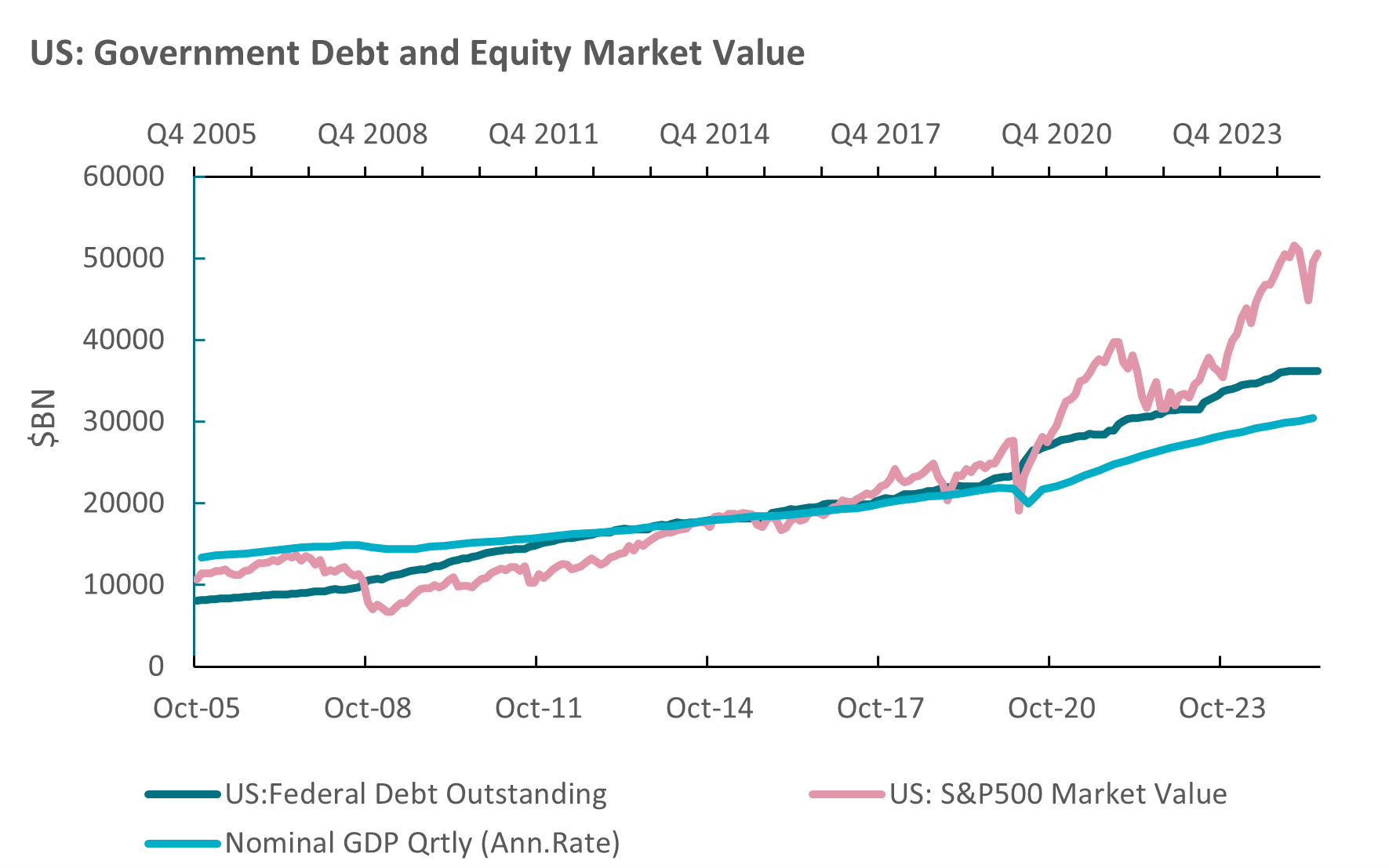 Rising equity markets mean rising wealth and support for economic growth. For now, this is outweighing concerns about public debt, especially in the US where equity market capitalisation as a percentage of GDP (around 165%) is much higher than public debt is as a percentage of GDP (125%) - see chart above. The equity buffer is lower in Europe, but strong equity performance is still positive for growth because it is based on companies delivering on real growth in revenues, which in turn is boosting investment spending with all the benefits that has for future activity and employment. Investors worry about how some governments will manage their public debt profiles, but growth is a necessary bulwark against debt unsustainability. So, for the sake of long-term premiums in fixed income markets, let’s hope the virtuous equity and economic growth circle can remain intact. An equity market correction leading to reduced growth expectations and tax revenues would not be good for the fiscal outlook, or for long-term bonds.