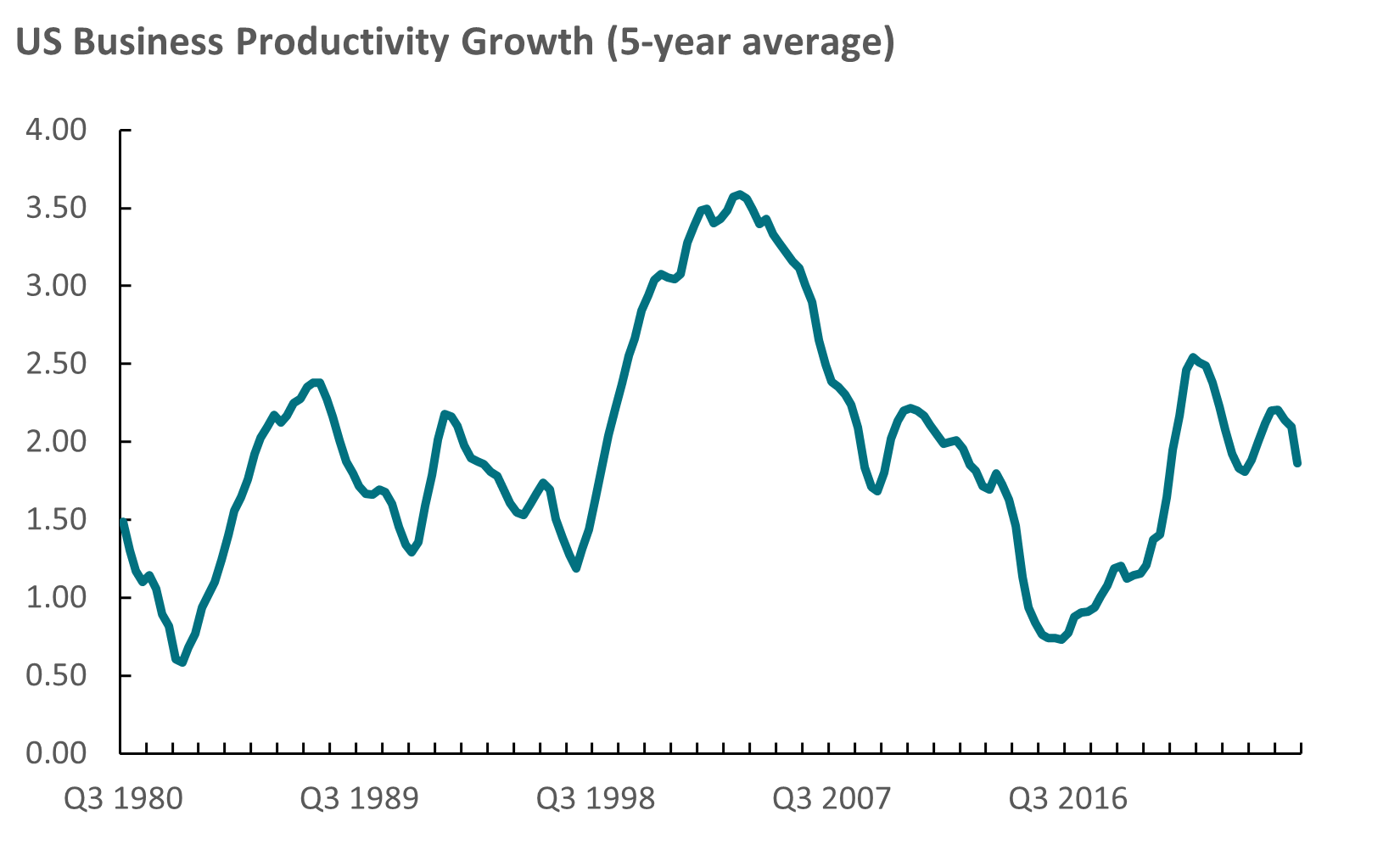 Core to the AI transition of economic life is the belief that it will boost productivity, by being a lot better at a lot of jobs, that humans do today - so those in work will be more productive. Output per hour worked is the key measure of productivity. AI promises the same amount of output can be produced with fewer hours (people) worked, or that more output can be produced with the same hours worked. It is a slow-moving measure and there is some scepticism around technology developments and productivity – as economist Robert Solow said: "You can see the computer age everywhere but in the productivity statistics." However, US data shows labour productivity did increase in the years after the digital revolution got going in the mid-1990s (the five-year average annual business productivity rate reached 3.5% at the beginning of the 2000s, see chart below). Increased digitalisation, automation, data storage and communication all contributed to the surge in productivity and another surge is expected by AI enthusiasts. If they are right, then the cycle can be extended, and we should start to see the benefits across the economy. AI can certainly play a key role in meeting the long-term challenges of fiscal stability (improved performance in the public sector), dealing with labour shortages in ageing societies, providing better and cheaper health provision, and optimising green energy and climate change adaption. But the effects take time because companies and individuals must learn how to use new technology and pay for it.